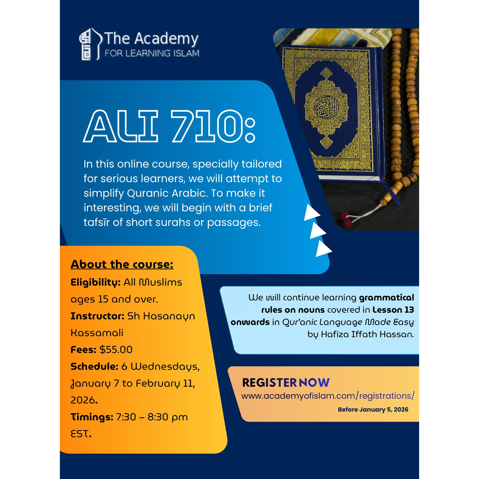 News & Updates Quranic Reflection No 764. Āyat 7:23 – From Descent to Return: The Repentance of Ādam (a) Fri Dec 19 2025 | 28 Jumada Al Akhira 1447AH Réflexion coranique n° 521 : Āyat 40:28 – La bravoure de Hizqīl Fri Dec 19 2025 | 28 Jumada Al Akhira 1447AH ALI 710: Quranic Arabic and knowledge – Level 4 Thu Dec 18 2025 | 27 Jumada Al Akhira 1447AH Quranic Reflection No 763. Āyat 3:42 – The Chosen Women in Islam Fri Dec 12 2025 | 21 Jumada Al Akhira 1447AH The Foundation of our Organization Post Madrasah Short CoursesShort courses on various Islamic topics to educate and inspire students, especially those who cannot commit to full time Islamic studies. Quran PortalRich set of resources for those wishing to study or teach about the Quran. Weekly Quranic Reflections, Quran Appreciation notes, and comprehensive Quran Tafsir resources. Unique ResourcesSpecial resources which are not commonly found. These include the Hadith database and the Sahifa as-Sajjadiyyah page which has lectures and articles on the Sahifa, as well as Duas of Sahifa with two English side by side translations. Featured Publications Daily Supplications0 out of 5 $12.00 Select options This product has multiple variants. The options may be chosen on the product page Knowing the Ma‘sūmīn – Imam Hasan al-Askari(a)0 out of 5 $2.50 – $6.00Price range: $2.50 through $6.00 Select options This product has multiple variants. The options may be chosen on the product page Knowing the Ma‘sūmīn – Imam Ja’far al-Sadiq (a)0 out of 5 $2.50 – $6.00Price range: $2.50 through $6.00 Select options This product has multiple variants. The options may be chosen on the product page Knowing the Ma‘sūmīn – Prophet Muhammad (s)0 out of 5 $2.50 – $6.00Price range: $2.50 through $6.00 Select options This product has multiple variants. The options may be chosen on the product page Rabī‘ and Jumādā Devotions0 out of 5 $5.00 – $12.00Price range: $5.00 through $12.00 Select options This product has multiple variants. The options may be chosen on the product page Tahajjud Salāt: The Spiritual Ladder0 out of 5 $12.00 Select options This product has multiple variants. The options may be chosen on the product page Explore our Resources Beliefs (Aqa’id) Islamic Beliefs are divided into various sections: God and His attributes, Prophethood and Leadership, and Eschatology. Family Life Islam provides instruction for all aspects of life. Unto this end, an important aspect of Islamic teachings pertains to family life. Practical Rulings The practical rulings of Islam constitute the primary responsibility a believer has after solidifying his belief in the tenants of Islam. Qur’an The book of God, revealed to His messenger. The Qur’an describes itself as a guidance to mankind, containing manifest poofs. Duas The Ma’sumin have taught us various supplication such as Sahifa-e-Sajjadiyya and Duas for various days and months of the year. ic_fluent_history_24_filled Created with Sketch. History The studying of Islamic History allows a believer to see inspiring and meaningful examples of Islam being practiced. By Occasion Various resources as pertains to specific occasions in the Islamic lunar calendar. Health Being a holistic religion, Islam advises believers to take care of their material needs in a lawful manner. Other Miscellaneous resources: Hadith, marriage forms, sample Islamic wills, etc.