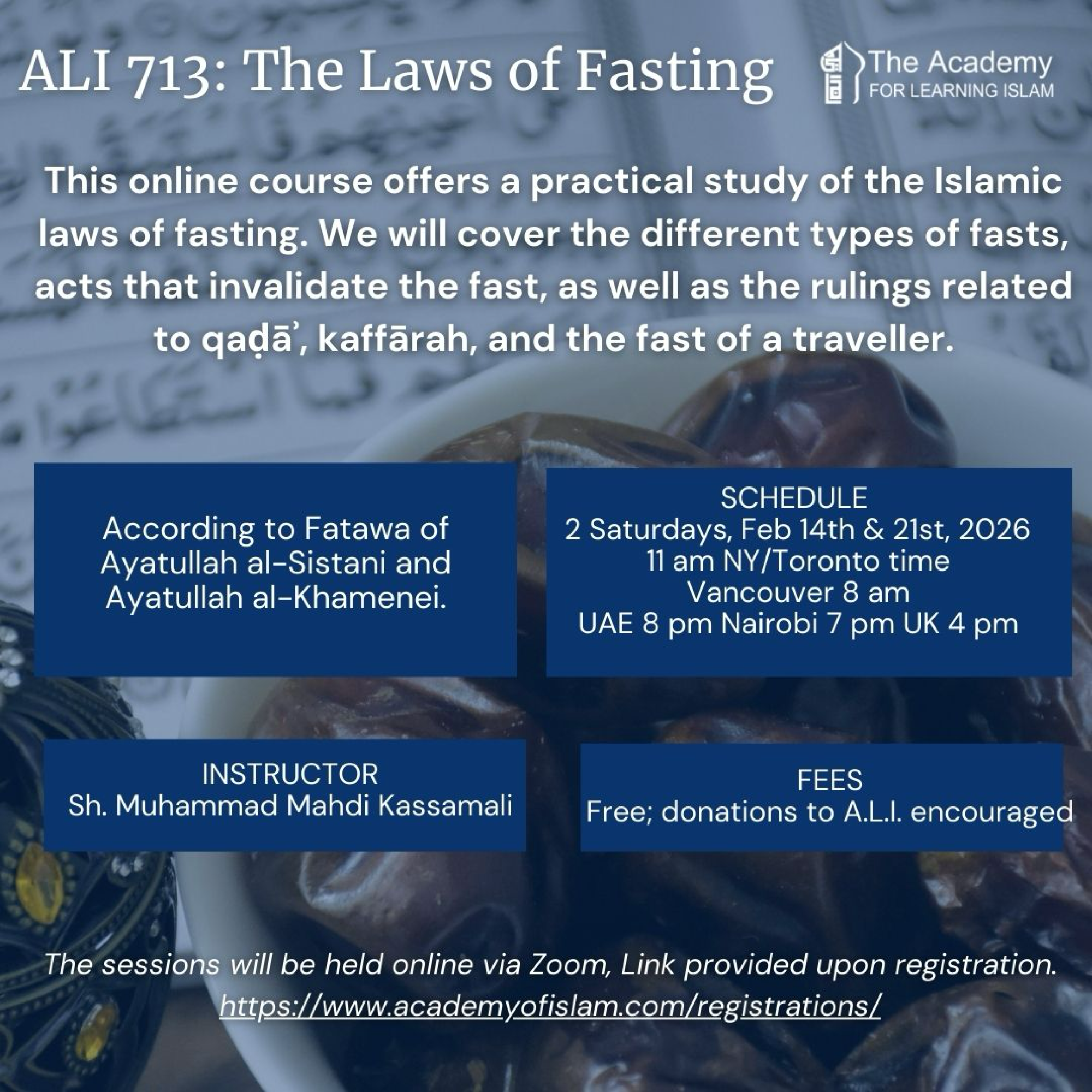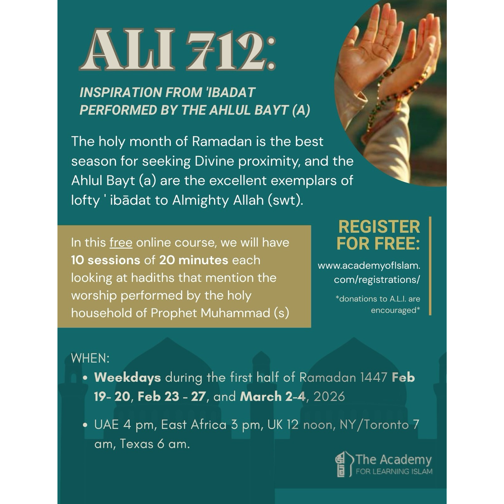 News & Updates ALI 713: The Laws of Fasting (Ṣawm) Fri Feb 6 2026 | 18 Shaban 1447AH Quranic Reflection No 771. Āyat 54:1 – Regarding the Splitting of the Moon Fri Feb 6 2026 | 18 Shaban 1447AH Réflexion coranique n° 528 : Āyat 18:110 – L’Espoir en la rencontre avec Allah (swt) Fri Feb 6 2026 | 18 Shaban 1447AH ALI 712: Inspiration from ‘Ibadat Performed by the Ahlul Bayt (a) Mon Feb 2 2026 | 14 Shaban 1447AH The Foundation of our Organization Post Madrasah Short CoursesShort courses on various Islamic topics to educate and inspire students, especially those who cannot commit to full time Islamic studies. Quran PortalRich set of resources for those wishing to study or teach about the Quran. Weekly Quranic Reflections, Quran Appreciation notes, and comprehensive Quran Tafsir resources. Unique ResourcesSpecial resources which are not commonly found. These include the Hadith database and the Sahifa as-Sajjadiyyah page which has lectures and articles on the Sahifa, as well as Duas of Sahifa with two English side by side translations. Featured Publications Knowing the Ma‘sūmīn – Imam Ali Zaynul ‘Ābidīn (a)0 out of 5 $2.50 – $6.00Price range: $2.50 through $6.00 Select options This product has multiple variants. The options may be chosen on the product page Knowing the Ma‘sūmīn – Imam Husayn (a)0 out of 5 $2.50 – $6.00Price range: $2.50 through $6.00 Select options This product has multiple variants. The options may be chosen on the product page Knowing the Ma‘sūmīn – Imam Muhammad Al-Mahdi (AF)0 out of 5 $2.50 – $6.00Price range: $2.50 through $6.00 Select options This product has multiple variants. The options may be chosen on the product page Nightly Devotions: Tahajjud Salat0 out of 5 $3.00 – $12.00Price range: $3.00 through $12.00 Select options This product has multiple variants. The options may be chosen on the product page Quranic Reflections – Book 20 out of 5 $6.00 Select options This product has multiple variants. The options may be chosen on the product page Rajab and Sha’baan Devotions0 out of 5 $4.00 – $15.00Price range: $4.00 through $15.00 Select options This product has multiple variants. The options may be chosen on the product page Explore our Resources Beliefs (Aqa’id) Islamic Beliefs are divided into various sections: God and His attributes, Prophethood and Leadership, and Eschatology. Family Life Islam provides instruction for all aspects of life. Unto this end, an important aspect of Islamic teachings pertains to family life. Practical Rulings The practical rulings of Islam constitute the primary responsibility a believer has after solidifying his belief in the tenants of Islam. Qur’an The book of God, revealed to His messenger. The Qur’an describes itself as a guidance to mankind, containing manifest poofs. Duas The Ma’sumin have taught us various supplication such as Sahifa-e-Sajjadiyya and Duas for various days and months of the year. ic_fluent_history_24_filled Created with Sketch. History The studying of Islamic History allows a believer to see inspiring and meaningful examples of Islam being practiced. By Occasion Various resources as pertains to specific occasions in the Islamic lunar calendar. Health Being a holistic religion, Islam advises believers to take care of their material needs in a lawful manner. Other Miscellaneous resources: Hadith, marriage forms, sample Islamic wills, etc.